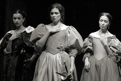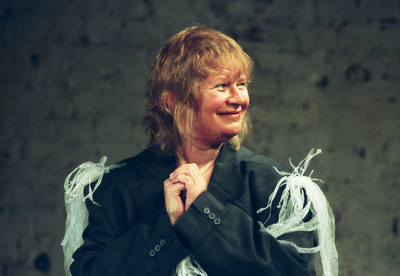 М.: Естественно, за мной следили в плане речи, у нас был замечательный педагог. Она меня очень любила. И я ее, колдунью, ведьму! (смеется) Она все время сидела, потому что плохо ходила. Но я до сих пор помню ее глаза — приковывающий взгляд. До занятий с ней у меня была определенная отстраненность от немецкого языка, по-русски у меня получалось совершенно по-другому играть, нежели чем по-немецки. Русская речь и русский текст — он льется сразу словно из сердца, а немецкий ты как будто бы цитируешь. Я чувствовала это и уже начинала ненавидеть немецкий язык за ту неестественность, с которой он у меня шел! Но она заставляла меня очень интенсивно заниматься, кричать, заниматься телом, читать немецкие стихи и вот этим-то она меня как раз и «пробила». Именно благодаря немецкой поэзии я начала чувствовать, как немецкий язык начинает раскрываться у меня внутри, как я начинаю «нести» его. И я полюбила этот язык. Прекрасный.